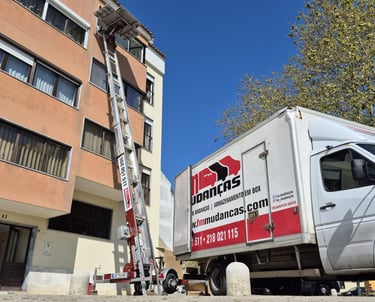 Serviço de elevador exterior para mudanças em edifícios sem acesso direto, ideal para apartamentos em altura, com total segurança.
